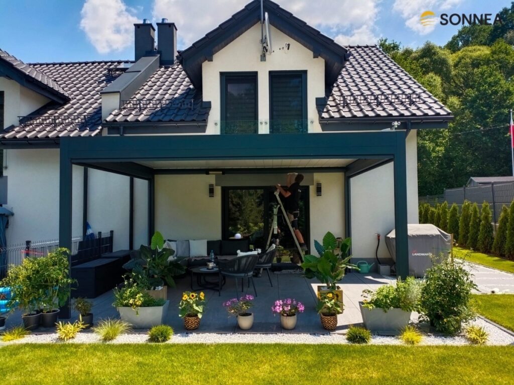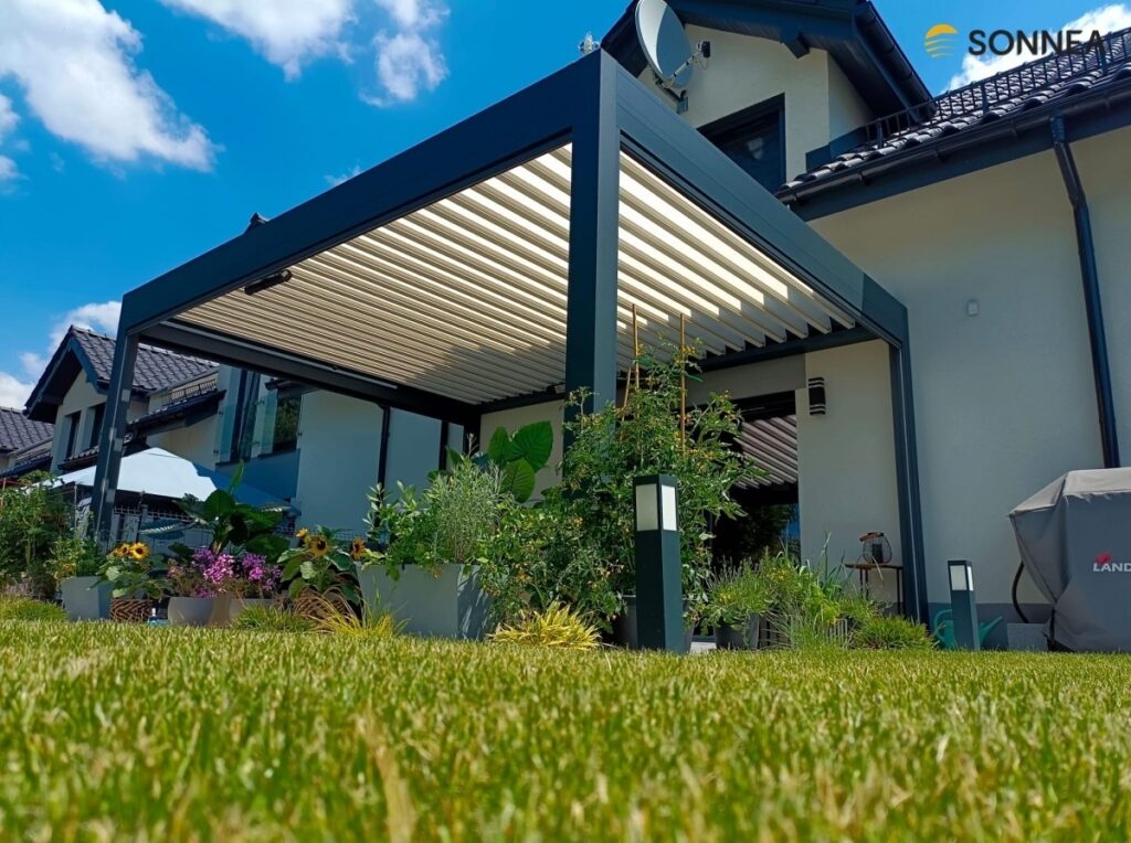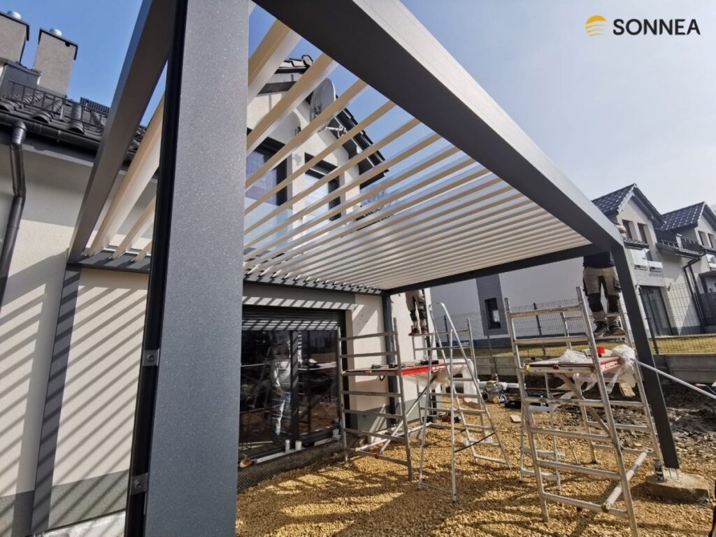 Eckdaten: · Modell: Climatic-P ⋅ Monatge: freistehend ⋅ Maße: 400×501,9 cm ⋅ Höhe: 265 cm ⋅ Konstruktionsfarbe: RAL 7016, Lamellenfarbe: RAL 9010 ⋅ Zubehör: LED-Beleuchtung, Seitenrollos Screen ZIP, Wärmestrahler, Audio-System, Regensensor, Windsensor ⋅ Lamellendrehung: 0°-135° ⋅ Windbeständigkeit: 160 km/h ⋅ Schneelast: 120 kg/m²